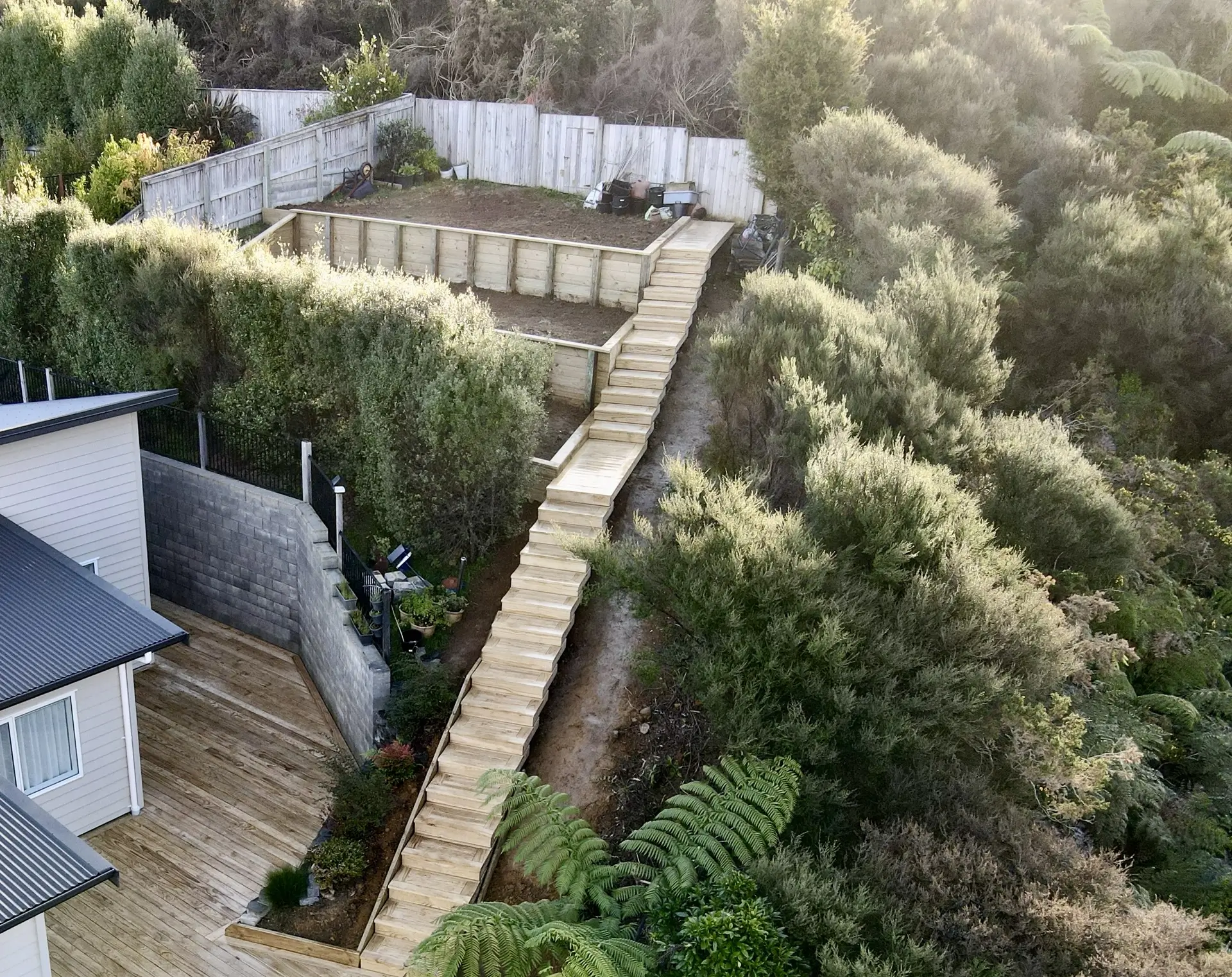 - Built robust multi-tiered retaining walls using treated timber sleepers to stabilize the challenging hillside terrain
